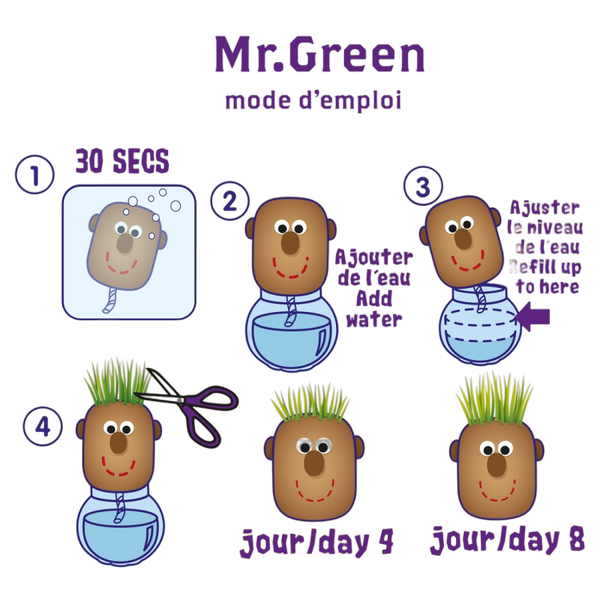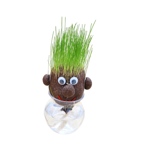 Zaai graszaadjes op het hoofd van Mr. Green en laat het grashaar groeien om het vervolgens te stylen. Maak jouw eigen vrolijke grashoofd!